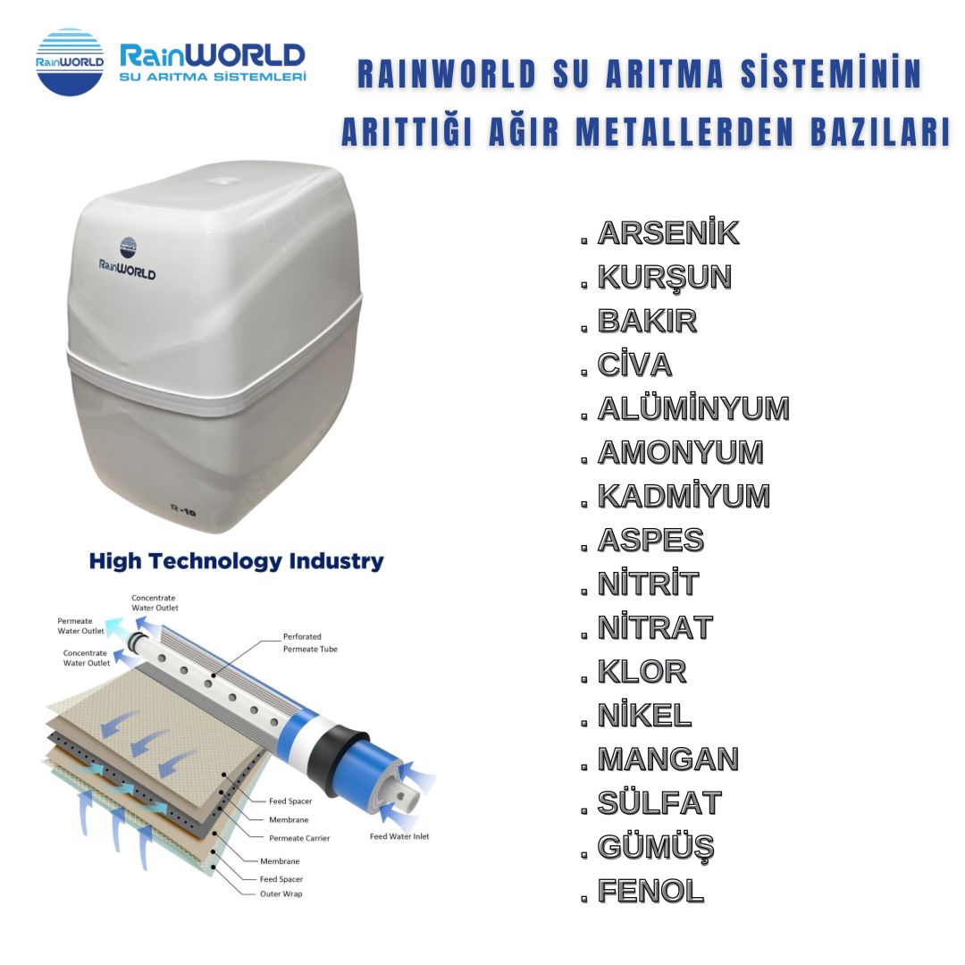 RainWORLD R-10 Su Arıtma Cihazı teknolojisinde Reverse osmosis+alkali teknolojisi bu sistem su moleküllerini yarı geçirgen bir membrandan basınç yolu ile geçirerek kirletici maddeleri ve ağır metalleri sudan yok eden bir su arıtma işlemidir. Bu işlem sırasında kirleticiler filtrelenir ve temiz, lezzetli içme suyu elde edilir. Daha sonrasında arıtılmış temiz suyu oksijen ve mineral filtrelerinden geçirerek mineral ve pH değeri yüksek en faydalı suya ulaşılır.